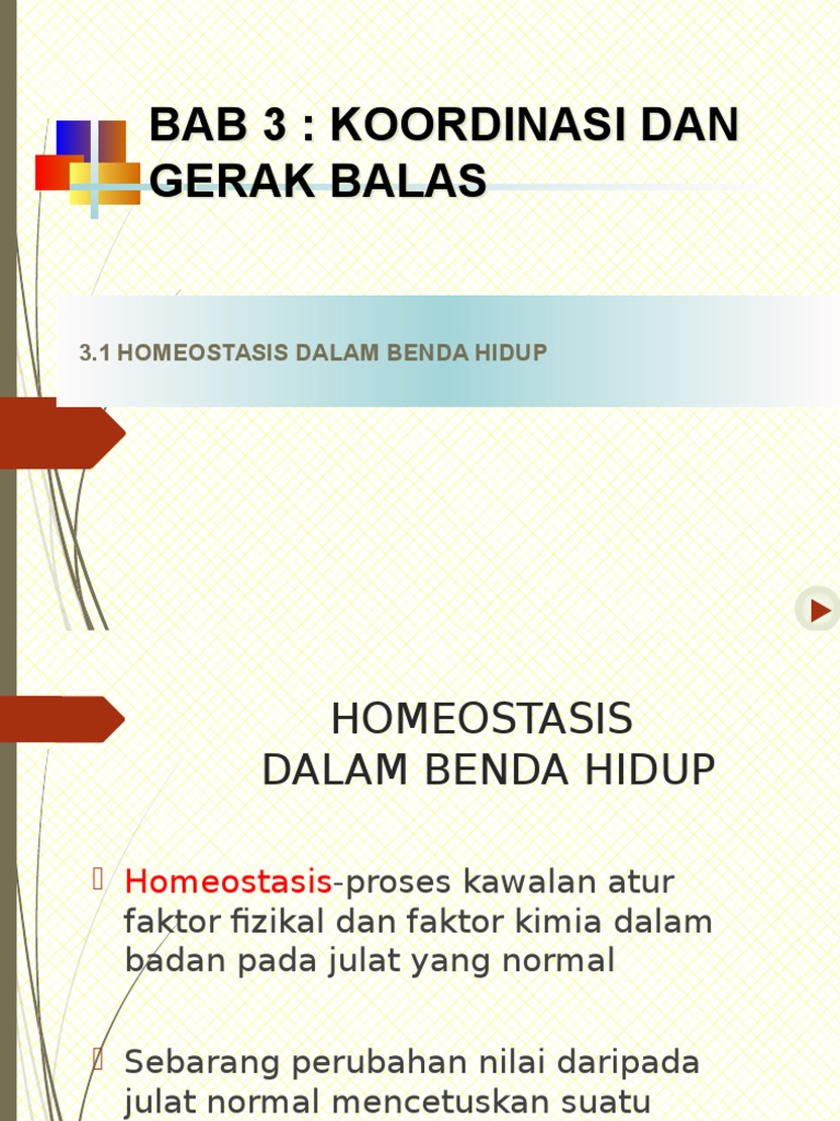 12 Makmal Sains anda. BAB 3 KOORDINASI DAN GERAK BALAS HOMEOSTASIS DALAM BENDA HIDUP f Maksud Homeostasis Pengekalan keadaan persekitaran dalam badan sesuatu organisma supaya berada dalam keadaan seimbang dan stabil. About Press Copyright Contact us Creators Advertise Developers Terms Privacy Policy Safety How YouTube works Test new features Press Copyright Contact us Creators.