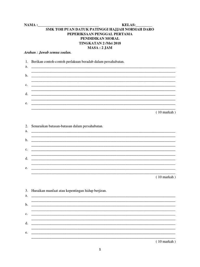 Soalan Pendidikan Moral Tingkatan 2 2018 Penggal 1 Pdf