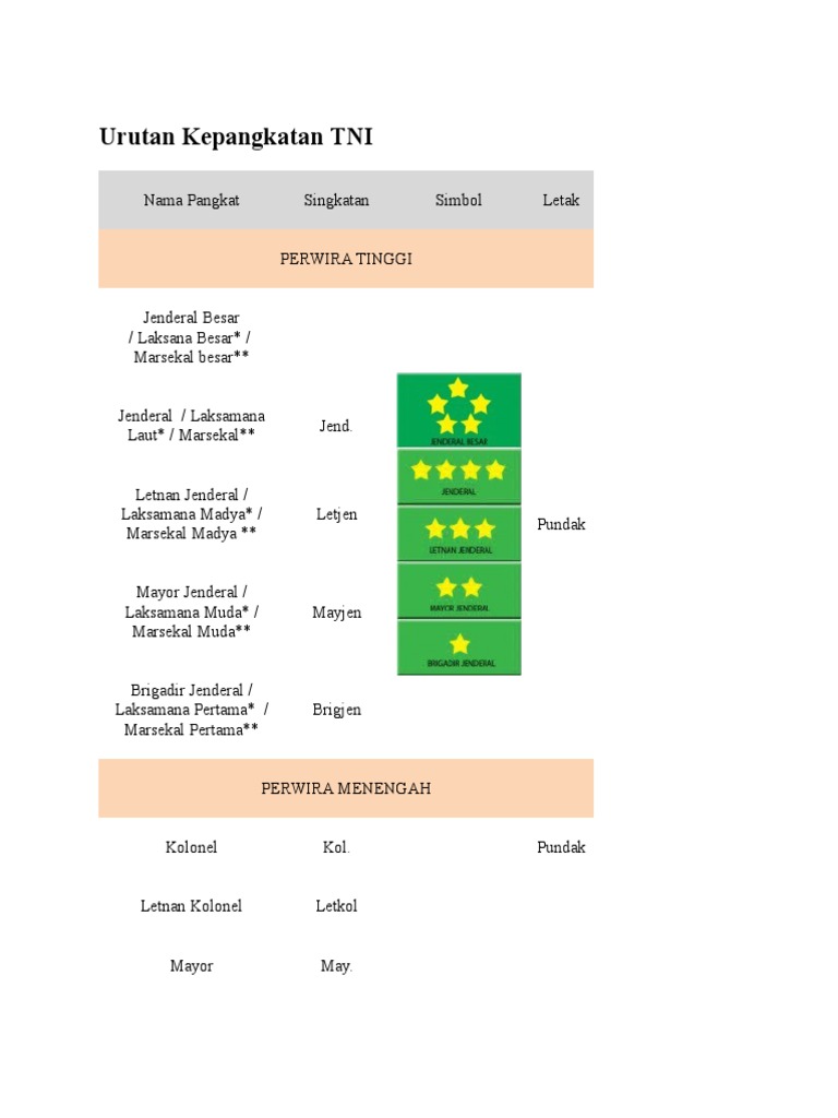 Pangkat ini menjadi tandang bahwa yang memilikinya merupakan seorang pemimpin tertinggi di. Letnan Jenderal Letjen Mayor Jenderal Pundak Mayjen Brigadir Jenderal Brigjen PERWIRA MENENGAH Kolonel Kol.